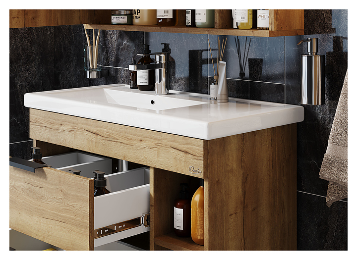 Тумба под раковину Onika ЛЕГРАН 80.13 дополнит интерьер ванной комнаты. Благодаря подвесной конструкции модель не занимает много места и облегчает уборку. Тумба оснащена 2 выдвижными ящиками с системой плавного закрывания и открытыми полками в боковой части. Изделие выполнено из ЛДСП, устойчивой к механическим воздействиям, перепадам температур и высокой влажности. Тумба используется вместе с раковиной Kirovit ФОСТЕР 80П. В комплект поставки входят 2 ручки и подвесы для крепления. Особенности: