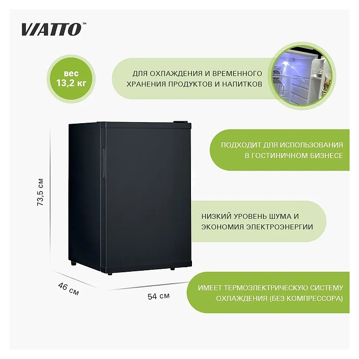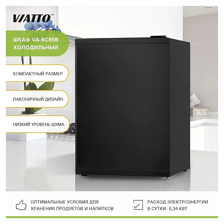 Холодильный шкаф VIATTO VA-BC65B предназначен для охлаждения и временного хранения продуктов и напитков на предприятиях общественного питания, торговли и гостиничного бизнеса. Модель оснащена LED-подсветкой, термоэлектрической системой охлаждения (без компрессора), которая обеспечивает низкий уровень шума и экономию электроэнергии, а также имеет компактные размеры. Корпус выполнен из окрашенной в чёрный цвет стали, камера - из пластика белого цвета. Дополнительные характеристики: