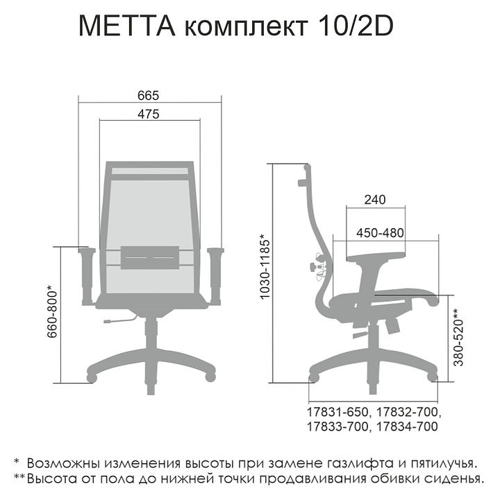 Кресло Метта Комплект 10/2D предназначено для долгой работы за компьютером на даче, дома, а также в офисах. Модель оснащена низкой спинкой и комфортным сиденьем. Сверхпрочный каркас кресла и регулируемый поясничный подпор изготовлены из стали с полимерным покрытием черного цвета и хромированным молдингом, обивка - из износостойкого перфорированного материала NewLether. Пятилучье в комплект поставки не входит и приобретается отдельно. Особенности: