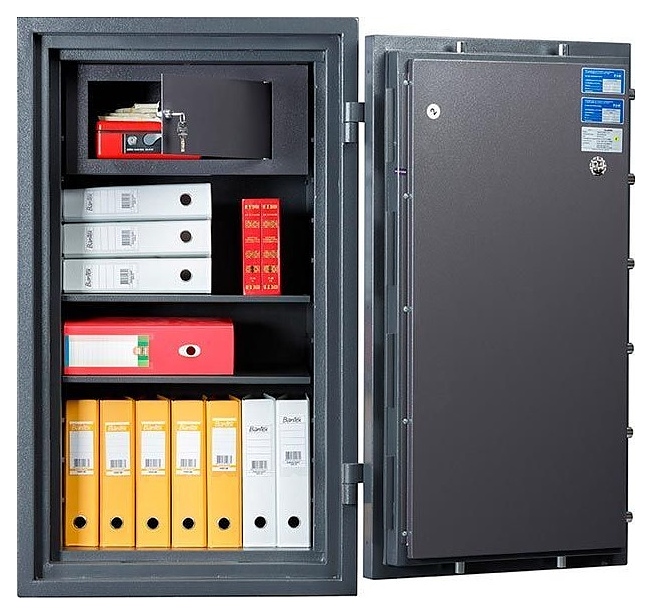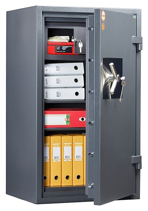 Огневзломостойкий сейф Valberg ГАРАНТ ЕВРО 120T предназначен для безопасного хранения документации, наличных денежных средств, ювелирных изделий и других ценностей в гостиницах, отелях, офисах, квартирах и загородных домах. Модель оснащена распашной трехкомпонентной дверью на усиленных внешних петлях и внутренним трейзером с самостоятельной запираемой на ключ дверцей. Корпус выполнен из высококачественной стали с износостойким эмалированным покрытием структурированный графит (RAL 7024), горизонтальная вставка на лицевой панели – из нержавеющей стали, внутренняя заливка двери и стенок – тяжелый бетон с запатентованной системой армирования. В комплект поставки входят анкерный болт и ключи. Особенности: