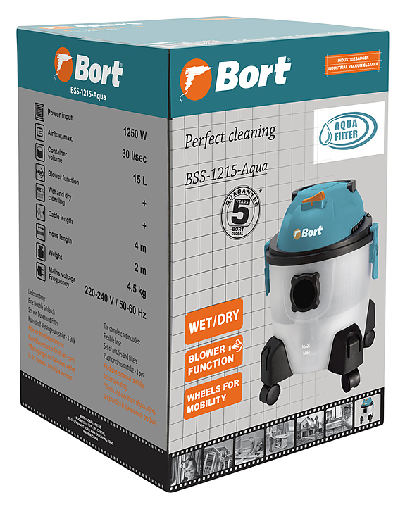 Пылесос Bort BSS-1215-Aqua предназначен для обработки различных напольных покрытий в частных домах, квартирах, отелях и офисах, гаражах и мастерских. Модель оснащена гибким всасывающим шлангом, аква-фильтром и колесами. Бак выполнен из пластика. Комплектация: