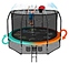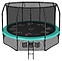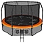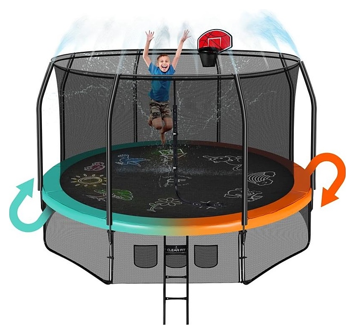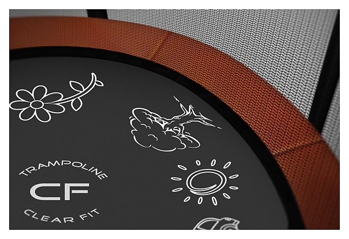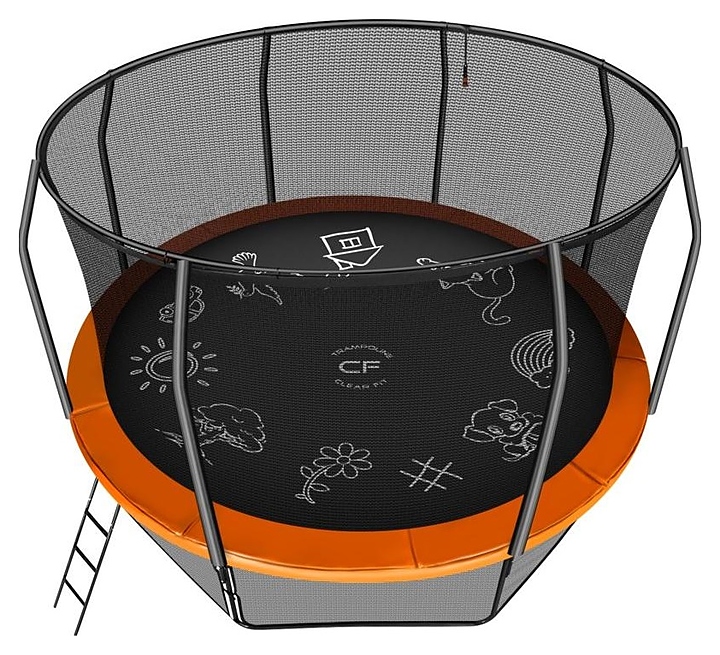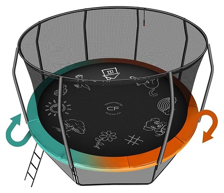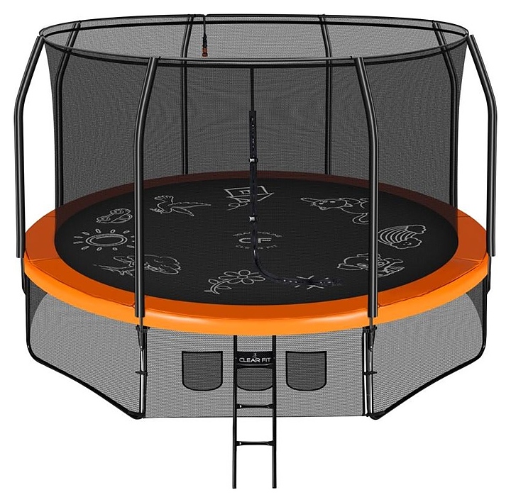 Каркасный батут CLEAR FIT FamilyHop 12Ft предназначен для широкого спектра тренировок с целью улучшения физической формы, выносливости, координации, работы сердечно-сосудистой и опорно-двигательной систем, нормализации метаболизма и снижения веса, а также развлечений для пользователей любого возраста. Модель оснащена прыжковым полотном и трубчатым каркасом с усиленными резьбовыми скобами. Каркас выполнен из стали Q195 с двойной антикоррозийной оцинковкой, прыжковое полотно – из перматрона (Permatron) с рисунком, пружины, метизы и соединения – из гальванизованной стали, двухслойная верхняя защитная сеть – из полиэтилена (PE), обшивка мата – из негорючего поливинилхлорида (PVC) оранжевого и зеленого цвета, внешний слой обшивки стоек – из поливинилхлорида (PVC) черного цвета, наполнитель мата и стоек – эластичный пенополиэтилен (EPE), W-опоры, лестница и нижние элементы стоек с покрытием черной порошоковой краской. Баскетбольный сет не входит в комплект поставки и приобретается отдельно. Комплектация: