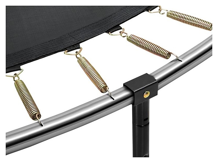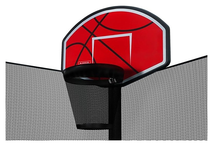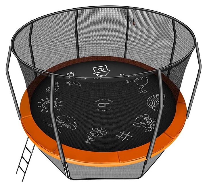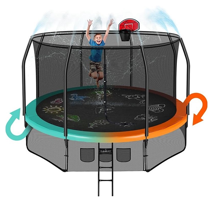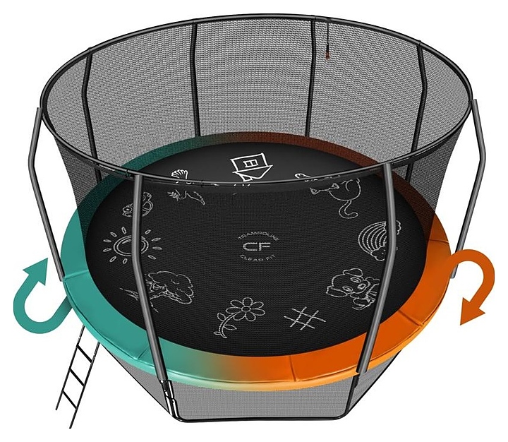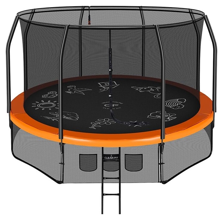 Каркасный батут CLEAR FIT FamilyHop 14Ft предназначен для широкого спектра тренировок с целью улучшения физической формы, выносливости, координации, работы сердечно-сосудистой и опорно-двигательной систем, нормализации метаболизма и снижения веса, а также развлечений для пользователей любого возраста. Модель оснащена прыжковым полотном и трубчатым каркасом с усиленными резьбовыми скобами. Каркас выполнен из стали Q195 с двойной антикоррозийной оцинковкой, прыжковое полотно – из перматрона (Permatron) с рисунком, пружины, метизы и соединения – из гальванизованной стали, двухслойная верхняя защитная сеть – из полиэтилена (PE), обшивка мата – из негорючего поливинилхлорида (PVC) оранжевого и зеленого цвета, внешний слой обшивки стоек – из поливинилхлорида (PVC) черного цвета, наполнитель мата и стоек – эластичный пенополиэтилен (EPE), W-опоры, лестница и нижние элементы стоек с покрытием черной порошоковой краской. Баскетбольный сет не входит в комплект поставки и приобретается отдельно. Комплектация: