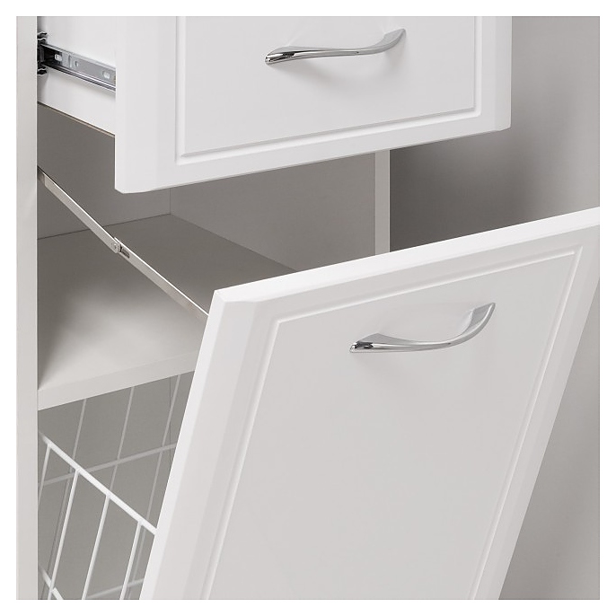 Шкаф-пенал Runo Севилья 35 выполнен в современном стиле и идеально впишется в интерьер любой ванной комнаты. Модель оснащена 2 распашными дверями и выдвижным ящиком на шариковых направляющих полного выдвижения посередине. Нижнее отделение комплектуется полкой и бельевой корзиной. Корпус выполнен из влагостойкой ЛДСП, фасад - из МДФ с пленкой ПВХ, которая отличается устойчивостью к повышенной влажности и простотой в уходе. Комплект поставки: