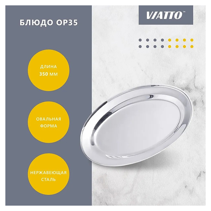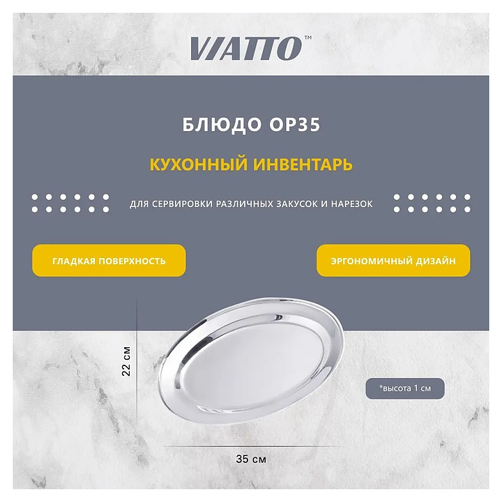 Блюдо VIATTO OP35 предназначено для сервировки шведских столов, на банкетах и фуршетах на предприятиях общественного питания и торговли. Модель имеет овальную форму. Изделие выполнено из высококачественной нержавеющей стали с гладкой поверхностью.