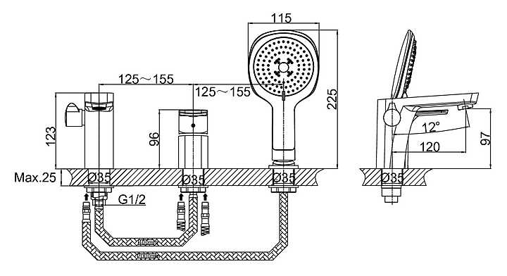Смеситель D&K Berlin Technische DA1434915 предназначен для установки на борт ванны для подачи горячей и холодной воды. Модель оснащена изливом, ручной лейкой и душевым шлангом, керамическим картриджем, обеспечивающим плавный ход рычага смесителя, контроль и точность при выборе напора и температуры воды, а также аэратором для создания мягкой ровной струи без разбрызгивания. Изделие выполнено из высококачественной латуни, отличающейся прочностью, долговечностью и устойчивостью к перепадам температур. В комплект поставки входят смеситель, излив с переключателем-дивертором, крепежная гайка, гибкая подводка шланг душевой и ручная лейка. Особенности: