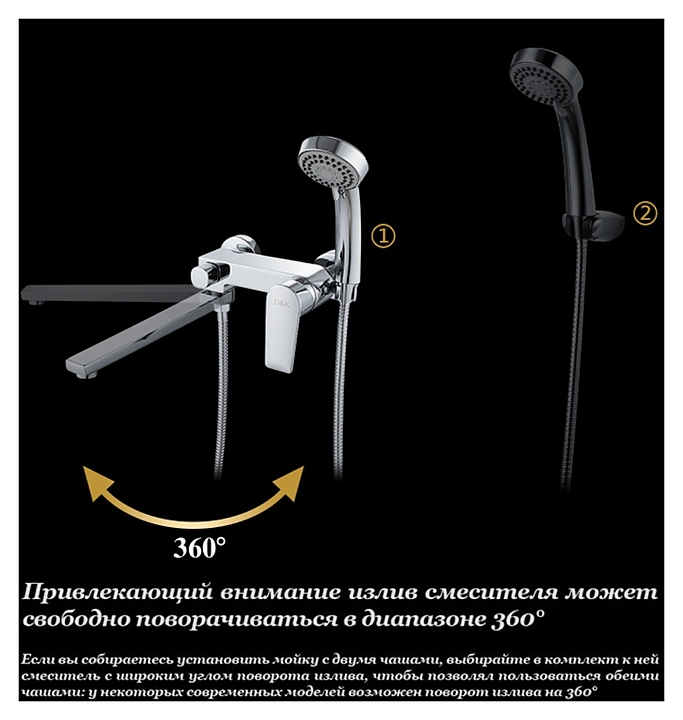 Смеситель D&K Rhein Lessing DA1323301 предназначен для использования в ванных комнатах для подачи горячей и холодной воды. Модель оснащена длинным поворотным изливом, трехрежимной ручной лейкой и душевым шлангом, керамическим картриджем, обеспечивающим плавный ход рычага смесителя, контроль и точность при выборе напора и температуры воды, а также аэратором для создания мягкой ровной струи без разбрызгивания. Изделие выполнено из высококачественной латуни, отличающейся прочностью, долговечностью и устойчивостью к перепадам температур. В комплект поставки входят cмеситель, излив, эксцентрики, декоративная шайба (отражатель), шланг душевой, лейка душевая и держатель душевой лейки. Особенности: