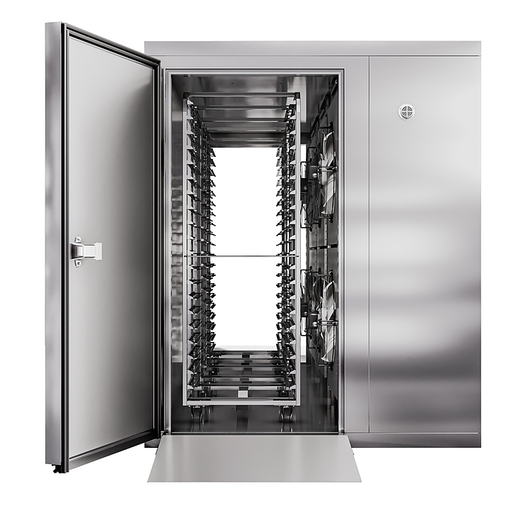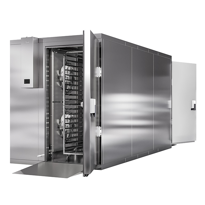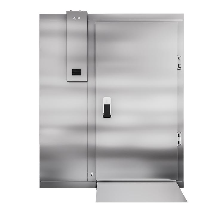 Камера шоковой заморозки Abat ШОКК-203 предназначена для быстрого охлаждения и замораживания различных пищевых продуктов и полуфабрикатов для дальнейшего их хранения на низкотемпературных складах предприятий общественного питания. Модель оснащена 3 воздухоохладителями с 2 вентиляторами каждый, навесными дверьми с низкотемпературным уплотнителем, подогревом и двусторонним замком. Пандусы и пол камеры выполнены из рифленого нержавеющего листа, стенки и потолок - сендвич-панели из высококачественной нержавеющей стали толщиной 80 мм. Особенности: