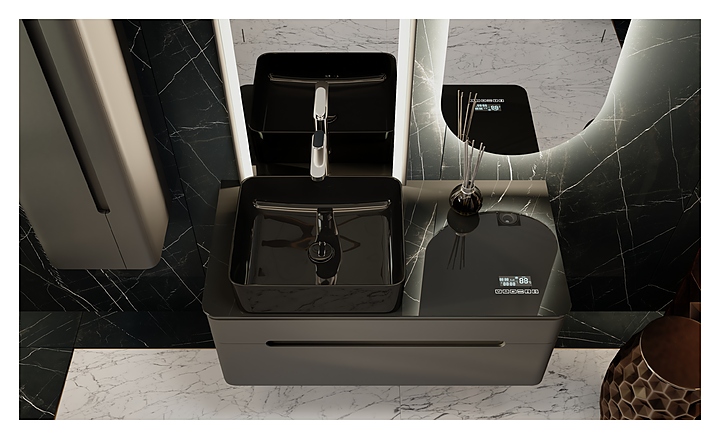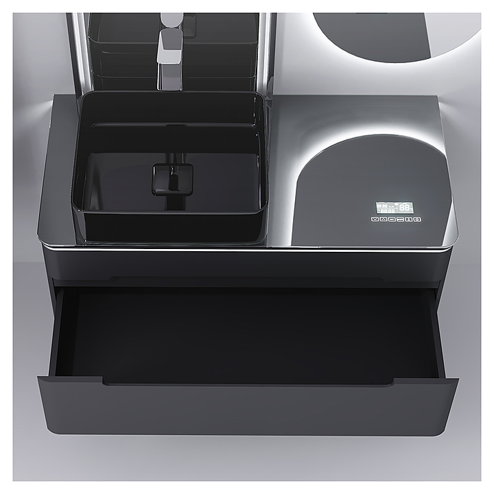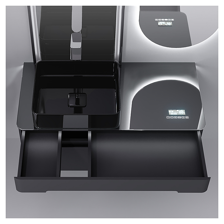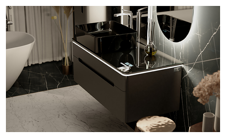 Тумба под раковину Jorno Shine 100 Shi.01.100-M/P/A дополнит интерьер ванной комнаты. Благодаря подвесной конструкции модель не занимает много места и облегчает уборку. Тумба оснащена 2 выдвижными ящиками и встроенным в столешницу многофункциональным модулем, который показывает температуру в помещении, время и дату, а также встроены 2 динамика для прослушивания музыки. Фасад и корпус изделия выполнены из МДФ в матовой пленке ПВХ, столешница с подсветкой - из стекла Lacobel. Дополнительные характеристики: