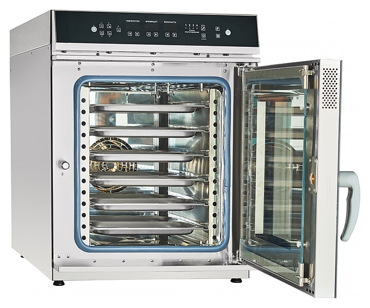 Пароконвектомат Abat ПКА 6-2/3В предназначен для приготовления широкого спектра блюд, выпечки хлебобулочных и кондитерских изделий в гостиничном и ресторанном бизнесе, на предприятиях пищевой промышленности, общественного питания и торговли. Модель оснащена воздушным трубчатым электронагревателем, вентилятором в задней стенке, дверью с поворотной рукояткой и смотровым окном, а также панелью управления с мембранной клавиатурой, светодиодными лампами индикации и цифровыми дисплеями. Внутренняя облицовка камеры, лопасти вентилятора и направляющие для противней выполнены из высококачественной нержавеющей стали, дверь и верхняя фронтальная панель в исполнении черного цвета. Пароконвектомат используется совместно с вытяжным зонтом Abat ЗВВ-750П. Гастроемкости не входят в комплект поставки и приобретаются отдельно. Рекомендуется дополнительно приобрести водоумягчитель и фильтр-систему для очистки и смягчения воды. Подробнее о необходимости водоподготовки читайте здесь. Особенности: