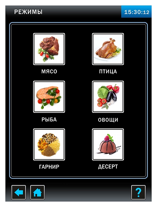 Индикация режимов и функций, температуры в камере и датчиков термощупа, влажности, скорости вентилятции, оставшегося времени и завершения приготовления