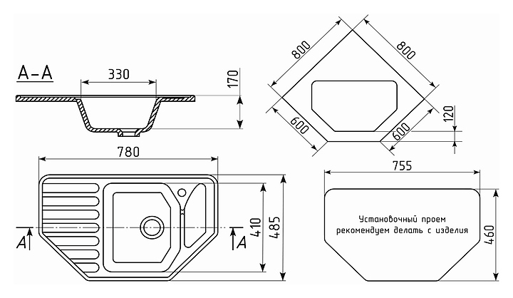 Мойка кухонная Mixline ML-GM24 (308) 48,5х78 см угловая с крылом, черная