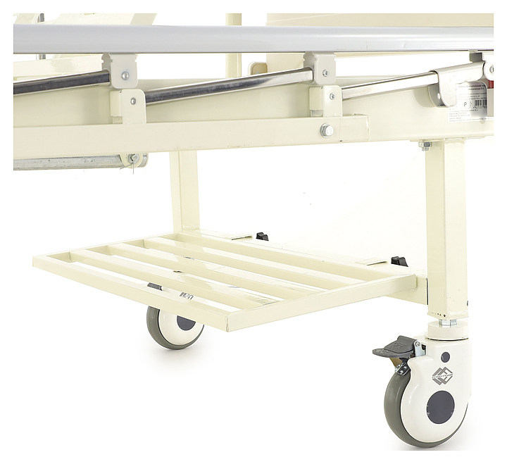 Медицинская кровать механическая Med-Mos Е-8 (MМ-2014Д-04) (У) с РУ используется в учреждениях здравоохранения для более комфортного пребывания в больнице лежачих больных с проблемами опорно-двигательного аппарата и пациентов, которые проходят процесс реабилитации после перенесенных операций или тяжелых заболеваний. Модель оснащена карманом из прозрачного пластика для карточки пациента на ножной спинке, пластиковыми заглушками на боковых ограждениях и быстросъемной полкой для гигиенического судна или обуви. Ложе, каркас и боковые ограждения выполнены из сварных конструкций из профильных труб из высокопрочной стали, покрытых ударопрочной эпоксидной эмалью, опорные стойки - из алюминиевого спплава, дуга для подтягивания и поперечины - из нержавеющей стали, торцевые спинки - из ЛДСП, поручни - из алюминиевого сплава, покрытого декоративной пленкой, заглушки - из пластика, шины колес - из полиуретана, инфузионная стойка - из нержавеющей стали с элементами из пластика, рукояти привода - из пластика. Кровать поставляется с регистрационным удостоверением Минздрава РФ. Комплектация:
