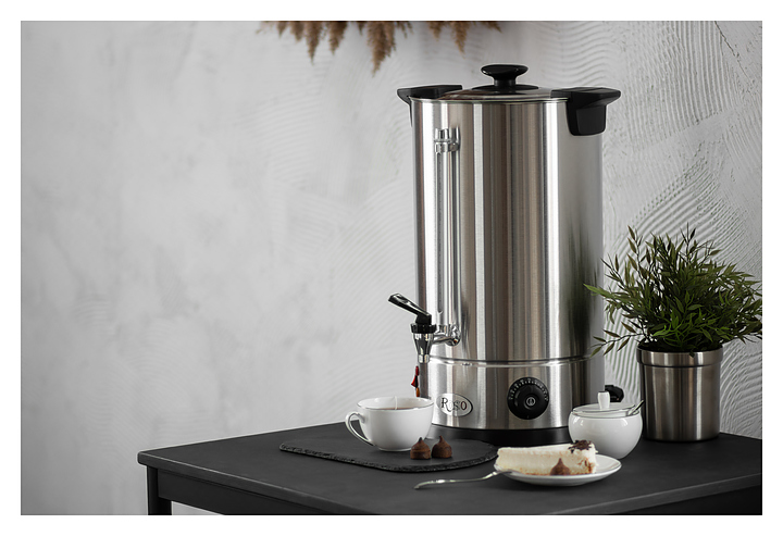 Кипятильник Rosso WB-25DB предназначен для кипячения и подогрева воды на предприятиях общественного питания и торговли. Настольная модель оснащена закрытым ТЭНом, прочным герметичным краном и термостатом, что позволяет довести воду до кипения и затем снизить ее температуру до необходимого безопасного уровня, что особенно важно при использовании на предприятиях с самообслуживанием. Корпус выполнен из нержавеющей стали, кран - из металла. Особенности: