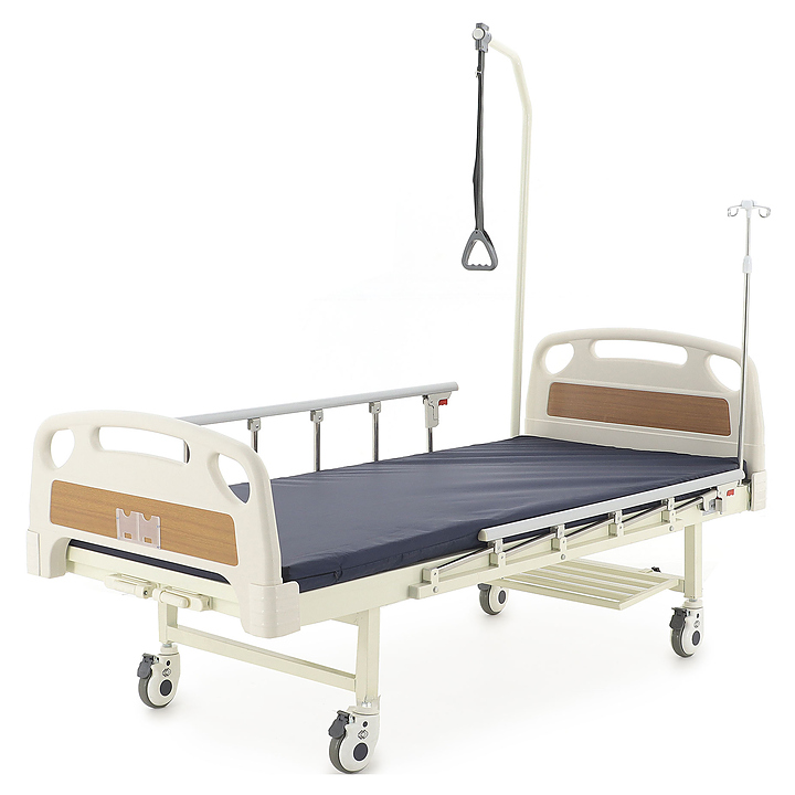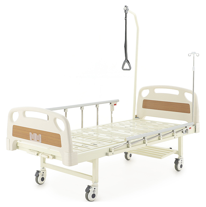Медицинская кровать механическая Med-Mos Е-8 (MМ-2014Д-04) (У) с РУ используется в учреждениях здравоохранения для более комфортного пребывания в больнице лежачих больных с проблемами опорно-двигательного аппарата и пациентов, которые проходят процесс реабилитации после перенесенных операций или тяжелых заболеваний. Модель оснащена карманом из прозрачного пластика для карточки пациента на ножной спинке, пластиковыми заглушками на боковых ограждениях и быстросъемной полкой для гигиенического судна или обуви. Ложе, каркас и боковые ограждения выполнены из сварных конструкций из профильных труб из высокопрочной стали, покрытых ударопрочной эпоксидной эмалью, опорные стойки - из алюминиевого спплава, дуга для подтягивания и поперечины - из нержавеющей стали, торцевые спинки - из ЛДСП, поручни - из алюминиевого сплава, покрытого декоративной пленкой, заглушки - из пластика, шины колес - из полиуретана, инфузионная стойка - из нержавеющей стали с элементами из пластика, рукояти привода - из пластика. Кровать поставляется с регистрационным удостоверением Минздрава РФ. Комплектация: