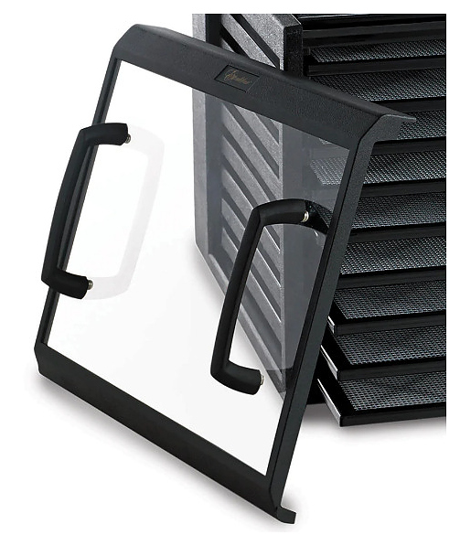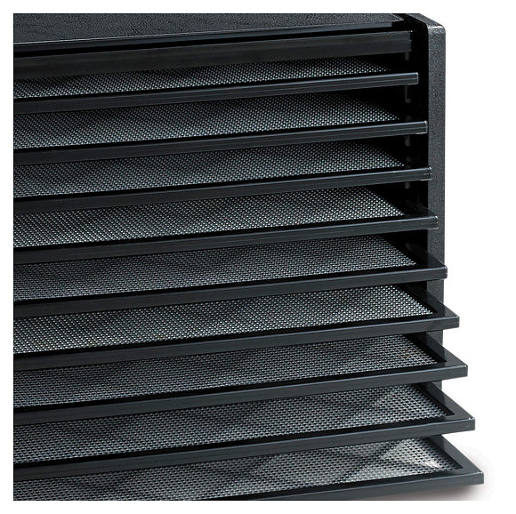 Дегидратор Excalibur 4948CDGB предназначен для сушки овощей, фруктов, ягод, орехов, грибов и трав, расстойки теста, приготовления йогурта, сыра, вяления мяса и рыбы на предприятиях общественного питания и в домашних условиях. Модель оснащена расположенными в задней стенке нагревательным элементом и вентилятором, электронным термостатом, съемной дверцей с 2 рукоятками и кнопочной панелью управления с жидкокристаллическим дисплеем. Лотки выполнены из высококачественного поликарбоната без содержания бисфенола А (BPA). В комплект поставки входят 9 лотков с гибкими вставками. Особенности: