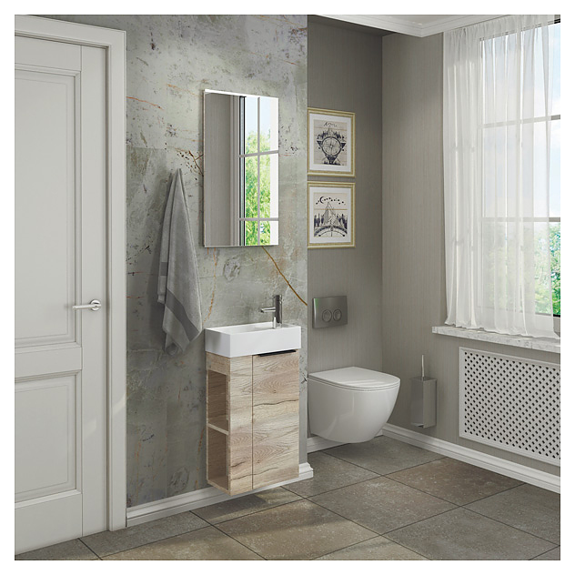 Тумба с раковиной Comforty Матэ-40 дополнит интерьер ванной комнаты. Благодаря подвесной конструкции модель не занимает много места, что экономит пространство и облегчает уборку. Тумба оснащена распашной дверью и открытыми полками в торцевой части. Раковина имеет слив-перелив и отверстие для смесителя. Изделие выполнено из влагостойкой ЛДСП, раковина - из санфарфора, который обладает повышенной прочностью и устойчивостью к негативным внешним факторам, а также долгое время сохраняет идеальную белизну и не впитывает запахи и грязь. В комплект входит раковина Cersanit Crea 40. Дополнительные характеристики: