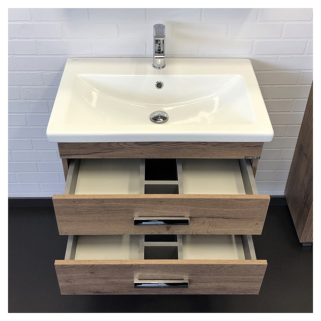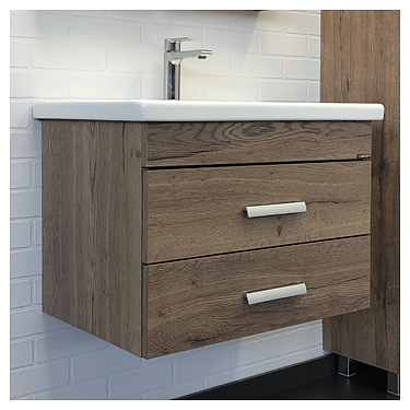 Тумба с раковиной Comforty Никосия-70П дополнит интерьер ванной комнаты. Благодаря подвесной конструкции модель не занимает много места, что экономит пространство и облегчает уборку. Тумба оснащена 2 выдвижными ящиками плавного закрывания. Раковина имеет широкую заднюю поверхность для размещения аксессуаров, слив-перелив и отверстие для смесителя, расположенное по центру. Изделие выполнено из влагостойкой ЛДСП, раковина - из санфарфора, который обладает повышенной прочностью и устойчивостью к негативным внешним факторам, а также долгое время сохраняет идеальную белизну и не впитывает запахи и грязь. В комплект входит раковина COMO 70. Дополнительные характеристики: