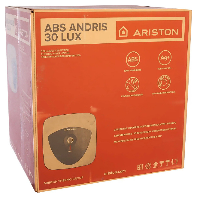 Электрический накопительный водонагреватель Ariston ABS ANDRIS LUX 30 используется в местных системах водоснабжения для постоянного автономного обеспечения горячей водой одной или нескольких точек водоразбора таких как санитарные узлы, кухни в жилых и загородных частных домах, а также других бытовых и хозяйственных объектах. Модель оснащена внутренним баком, погружным трубчатым электронагревателем (ТЭНом) с фланцевым креплением, резьбовыми штуцерами для подвода холодной и выхода горячей воды, стержневым термостатом и кабелем питания с вилкой. Корпус кубической формы со сглаженными углами выполнен из ударопрочного пластика белого цвета с черной фронтальной крышкой, внутненний бак – из стали, термоизоляция – из полиуретана высокой плотности. В комплект поставки входят монтажный кронштейн, заводская упаковка, инструкция по эксплуатации и гарантийный талон. Особенности: