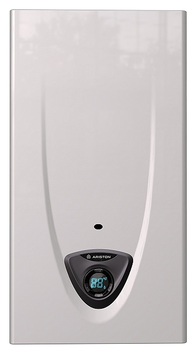 Газовый проточный водонагреватель Ariston FAST EVO ONT C 11 NG RU используется в местных системах водоснабжения для постоянного автономного обеспечения горячей водой одной или нескольких точек водоразбора таких как санитарные узлы, кухни в жилых и загородных частных домах, а также других бытовых и хозяйственных объектах. Модель оснащена горелкой с 11 форсунками, теплообменником с трубчатым контуром, стабилизатором тяги в виде перфорированного короба, дымовыводящим отверстием, резьбовыми штуцерами для подключения газа, подвода холодной и выхода горячей воды, кабелем питания с вилкой и электронной панелью управления с цифровым дисплеем. Вертикально ориентированный корпус с прямоугольными гранями выполнен из стали с треугольной вставкой черного цвета, теплообменник – из меди. В комплект поставки входят набор монтажных креплений, заводская упаковка, инструкция по эксплуатации и гарантийный талон. Особенности: