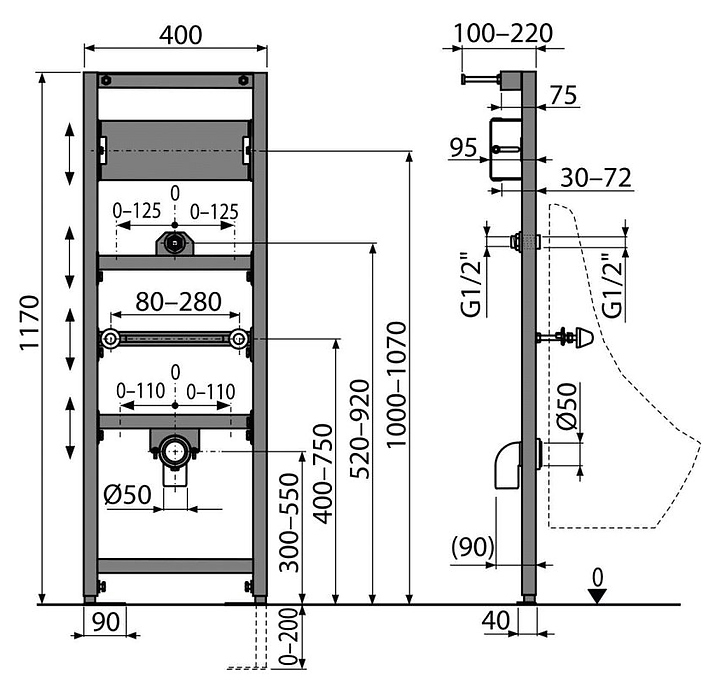 Система инсталляции AlcaPlast A107S/1200 предназначена для монтажа подвесного писсуара. Модель представляет собой рамную конструкцию с системой смыва. Рама выполнена из металла обработанного порошковой краской с высокоэффективной антикоррозионной защитой. В комплект поставки входят все необходимые крепления. Комплектация: