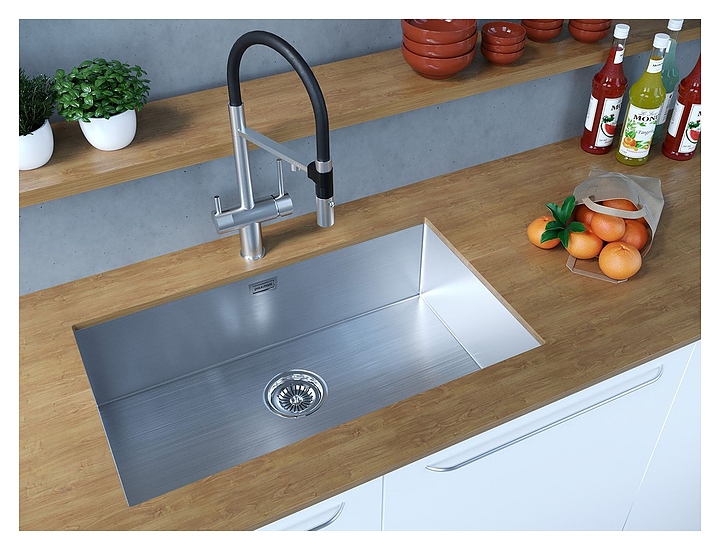 Мойка Paulmark Koher PM807444-BS предназначена для рационального планирования рабочего места на кухне. Модель устанавливается сверху, снизу или в один уровень со столешницей. Изделие выполнено из нержавеющей стали, которая отличается надежностью, ударопрочностью и стойкостью к износу. В комплект поставки входят крепления, сливная арматура, сифон, слив-перелив и корзинчатый вентиль. Дополнительные характеристики: