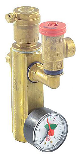 Группа безопасности Giacomini R554P предназначена для совместного использования с котлами для защиты закрытых систем теплоснабжения. Модель оснащена предохранительным клапаном, манометром и автоматическим удалителем воздуха с автоматическим запорным устройством. Корпус устройства выполнен из латуни. В комплект поставки входит латунный корпус, автоматический воздухоотводный клапан R88I с отсечным клапаном, предохранительный клапан R140R на 3 бар, манометр 0 # 4 бар R225, вывод для реле1/4”. Характеристики:
