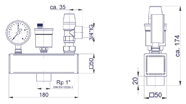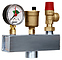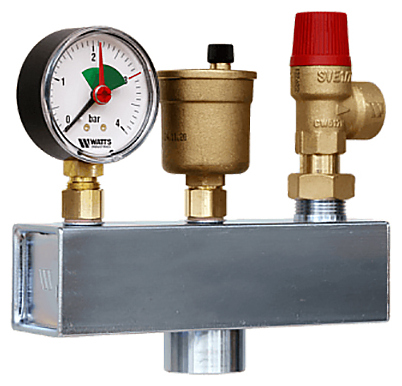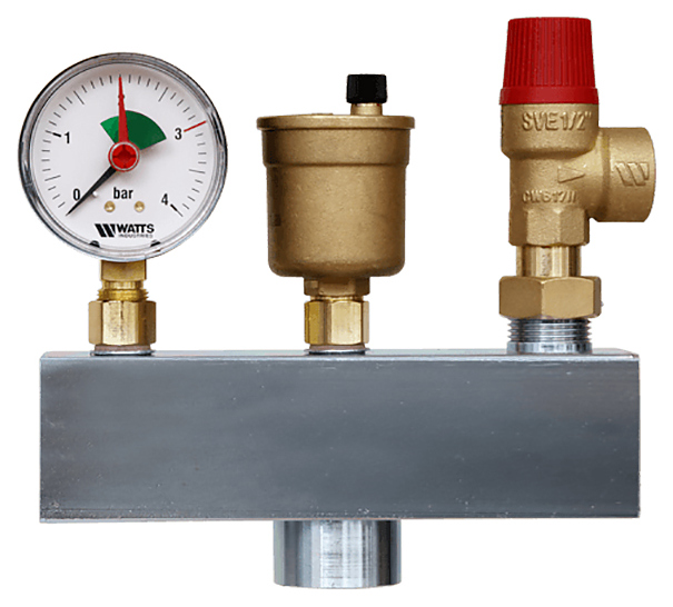 Группа безопасности Watts KSG 30/E предназначена для совместного использования с котлами для защиты закрытых систем теплоснабжения. Модель оснащена предохранительным клапаном, манометром и автоматическим удалителем воздуха с автоматическим запорным устройством. Корпус устройства выполнен из латуни. В комплект поставки входит латунный корпус, автоматический воздухоотводный клапан R88I с отсечным клапаном, предохранительный клапан R140R на 3 бар, манометр 0 # 4 бар R225, вывод для реле1/4”. Характеристики: