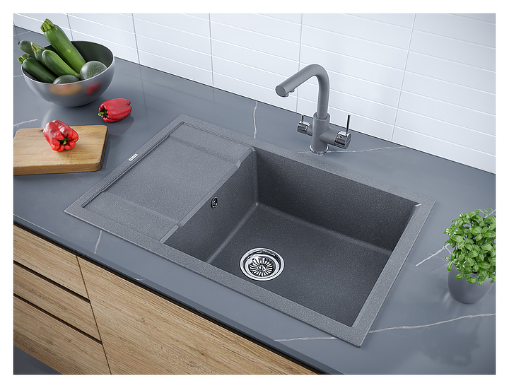 Мойка Paulmark Verlass PM317850-DG предназначена для рационального планирования рабочего места на кухне. Крыло-сушилка служит подставкой для посуды и продуктов. Мойка оснащена одинарным телескопическим сифоном с круглым переливом TRUST PM1022-CR, благодаря уникальной конструкции которого под кухонной мойкой освобождается пространство для бытовых принадлежностей, а также предусмотрена возможность подключения стиральных и посудомоечных машин. Изделие выполнено из кварцевого композита, который отличается высокой прочностью, устойчивостью к царапинам, долговечностью, безопасностью и экологичностью, а также имеет гладкую поверхность без пор, гарантирующую гигиеничность. В комплект поставки входят крепления, сливная арматура, сифон, слив-перелив и корзинчатый вентиль. Дополнительные характеристики:
