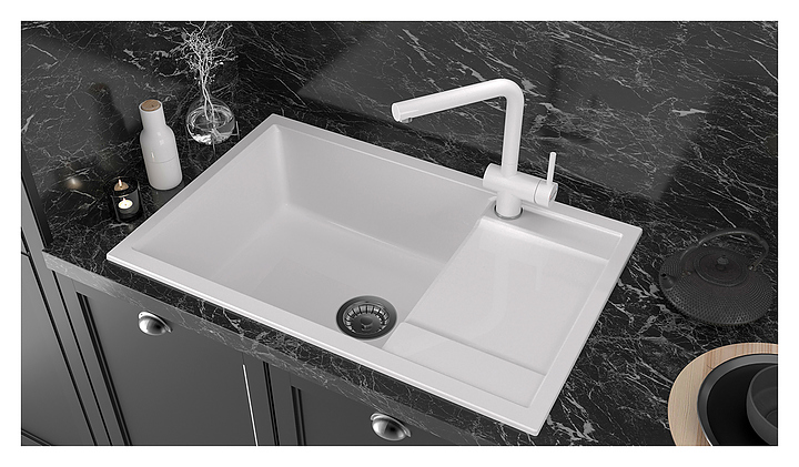 Мойка Paulmark Verlass PM317850-WH предназначена для рационального планирования рабочего места на кухне. Крыло-сушилка служит подставкой для посуды и продуктов. Модель оснащена одинарным телескопическим сифоном с круглым переливом TRUST PM1022-CR, благодаря уникальной конструкции которого под кухонной мойкой освобождается пространство для бытовых принадлежностей, а также предусмотрена возможность подключения стиральных и посудомоечных машин. Изделие выполнено из кварцевого композита, который отличается высокой прочностью, устойчивостью к царапинам, долговечностью, безопасностью и экологичностью, а также имеет гладкую поверхность без пор, гарантирующую гигиеничность. В комплект поставки входят крепления, сливная арматура, сифон, слив-перелив и корзинчатый вентиль. Дополнительные характеристики: