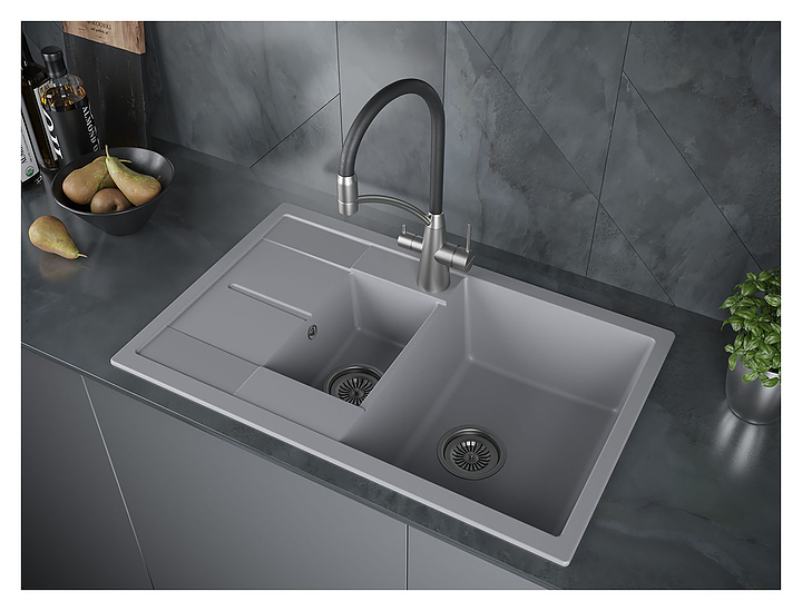 Мойка Paulmark Feste PM237850-GRM предназначена для рационального планирования рабочего места на кухне. Вместительная чаша большого размера и небольшая дополнительная чаша расположены параллельно друг другу. Модель имеет 2 намеченных отверстия для смесителя, оснащена широкими поверхностями вокруг малой чаши для размещения смесителя и аксессуаров и двойным телескопическим сифоном с круглым переливом TRUST PM1023-CR, благодаря уникальной конструкции которого под кухонной мойкой освобождается пространство для бытовых принадлежностей, а также предусмотрена возможность подключения стиральных и посудомоечных машин. Крыло-сушилка служит подставкой для посуды и продуктов. Изделие выполнено из кварцевого композита, который отличается высокой прочностью, устойчивостью к царапинам, долговечностью, безопасностью и экологичностью, а также имеет гладкую поверхность без пор, гарантирующую гигиеничность. В комплект поставки входят крепления, сливная арматура, сифон, слив-перелив и корзинчатый вентиль. Дополнительные характеристики: