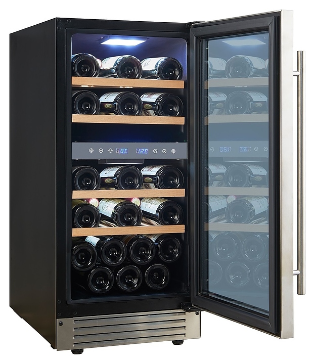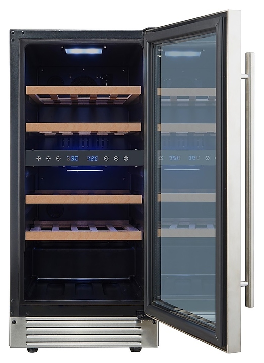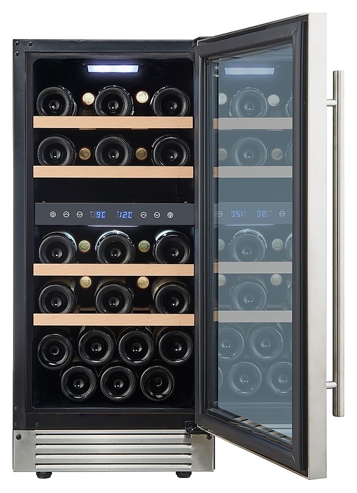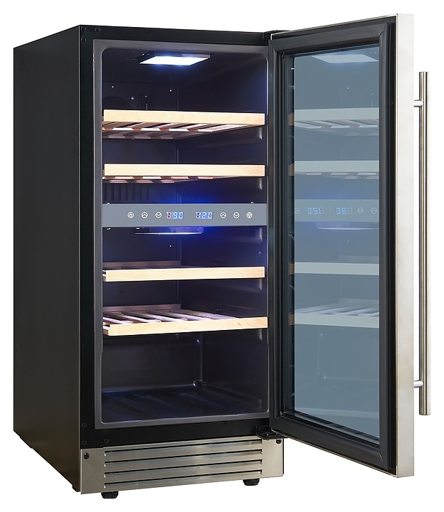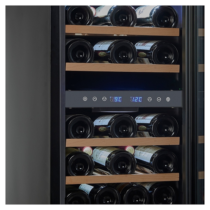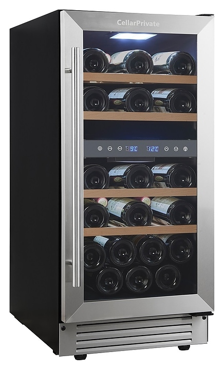 Встраиваемый винный шкаф Cellar Private CP027-2T предназначен для хранения при оптимальных условиях бутилированного вина различных сортов в барах, ресторанах, специализированных магазинах, подсобных складских помещениях, а также в домашних условиях. Модель оснащена холодильной камерой с 2 температурными зонами, 4 съемными полками, распашной перенавешиваемой дверью с длинной вертикальной рукояткой и прозрачным тонированным обзорным стеклом, а также сенсорной панелью управления с 2 цифровыми дисплеями внутри камеры. Корпус выполнен из металла с покрытием черного цвета, дверь и рукоятка серебристого цвета, полки – из массива древесины. Особенности: