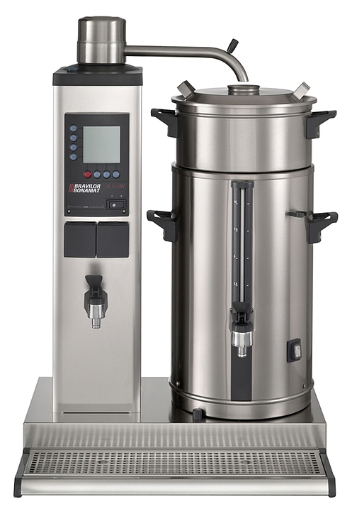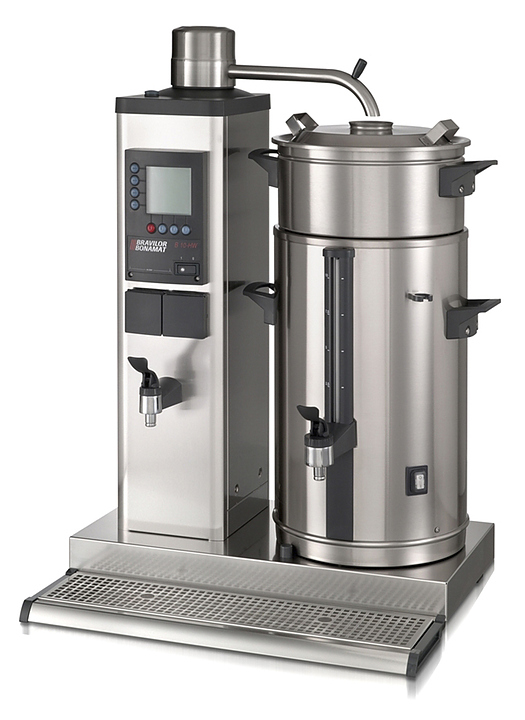 Кофеварка Bravilor Bonamat B10 HW L используется на предприятиях общественного питания и торговли для приготовления фильтрованного кофе и горячей воды, предназначенной для супа, каши, чая и других горячих напитков. Модель оснащена цифровым дисплеем, системой заваривания, емкостью для кофе с подогревом, заварной чашей, отдельным краном для горячей воды, индикатором заполнения, готовности кофе и удаления накипи и поддоном для капель. Корпус выполнен из нержавеющей стали. Особенности: