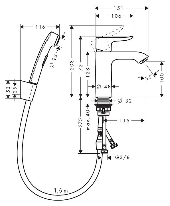 Смеситель для раковины с гигиеническим душем Hansgrohe Metris 31285000 со сливным клапаном Push-Open