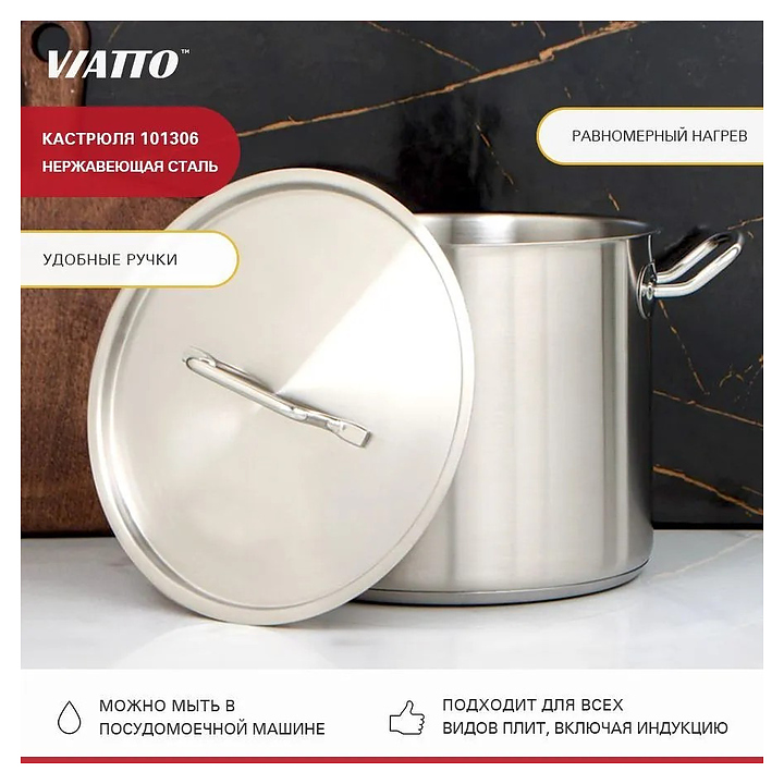 Кастрюля VIATTO 101306 используется на предприятиях общественного питания и торговли, в частных домах и квартирах для приготовления широкого спектра блюд. Модель оснащена 2 ручками на заклепках. Изделие выполнено из нержавеющей стали, дно - тройное. В комплект поставки входит крышка. Дополнительные характеристики: