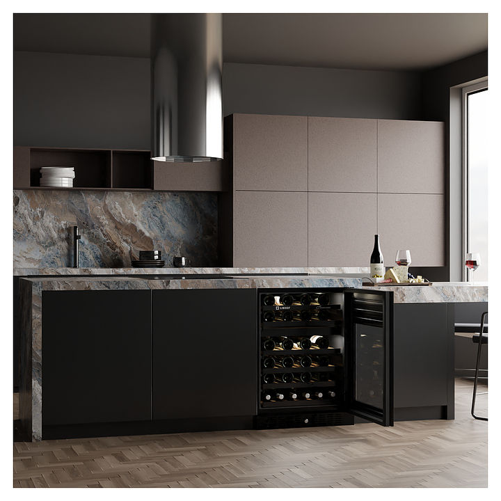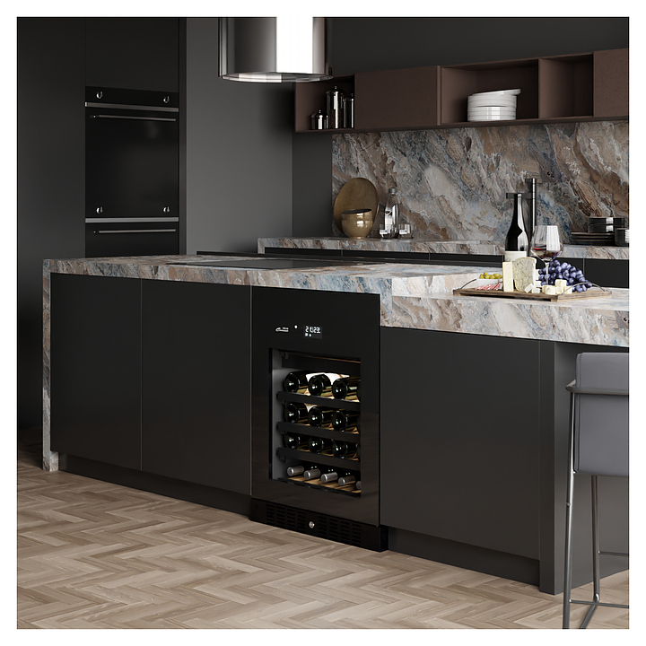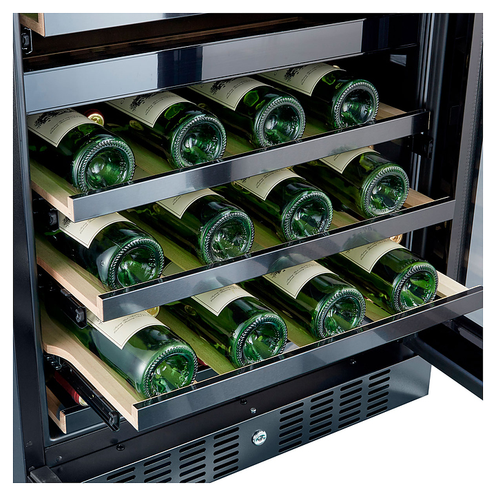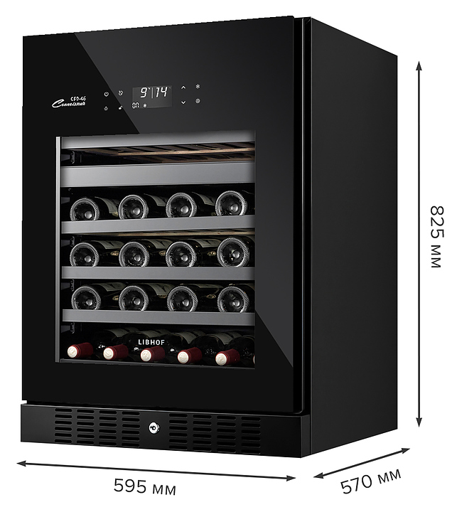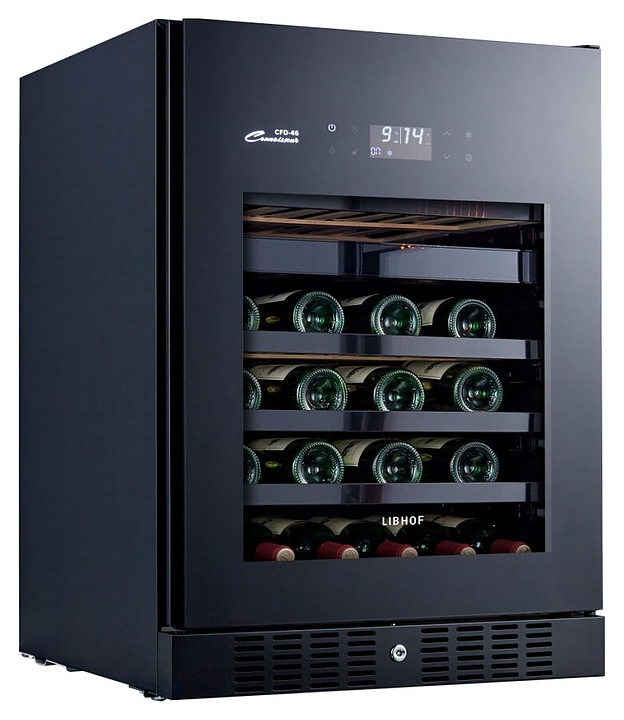 Встраиваемый винный шкаф Libhof Connoisseur CFD-46 Black предназначен для хранения при оптимальных условиях бутилированного вина различных сортов в барах, ресторанах, специализированных магазинах, подсобных складских помещениях, а также домашних условиях. Модель оснащена холодильной камерой с 2 независимыми температурными зонами, съемной цокольной вентиляционной решеткой, запираемой на ключ распашной дверью на внешних петлях, интегрированной рукояткой, прозрачным дымчатым обзорным остеклением, внешней сенсорной панелью управления и цифровым дисплеем. Корпус выполнен из металла с антикоррозийным покрытием черного цвета, полки – из массива буковой древесины с металлической окантовкой фасада. В комплект поставки входят 6 полок с направляющими для размещения бутылок, ключ от дверного замка и инструкция по эксплуатации. Особенности: