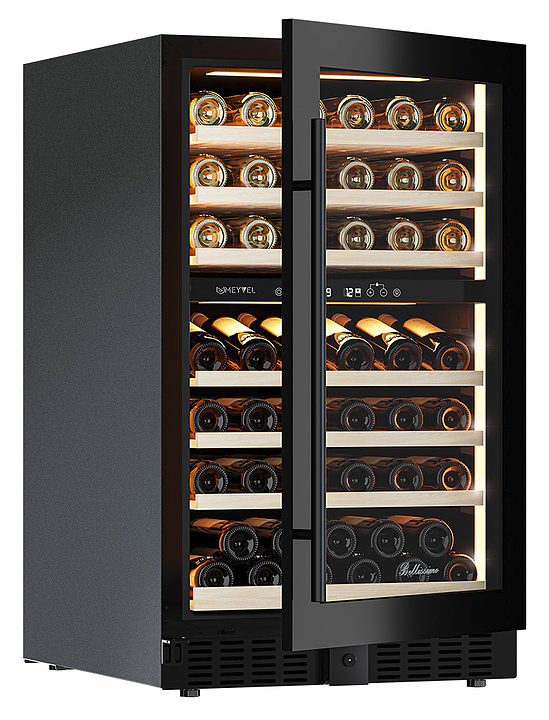 Винный шкаф MEYVEL MV77PRO-KBT2 предназначен для демонстрации, хранения и создания оптимальных условий для сохранения всех вкусовых свойств вина в бутылках на предприятиях общественного питания, торговли, в барах, ресторанах, специализированных магазинах, частных домах или квартирах. Модель оснащена сенсорной панелью управления, 2 электронными термостатами и внутренней светодиодной подсветкой. Корпус и дверная ручка выполнены из окрашенной в черный цвет стали, дверь - из тройного стекла с УФ защитой с черной рамкой, полки - из массива бука. В комплект поставки входят петли для перенавешивания двери. Особенности: