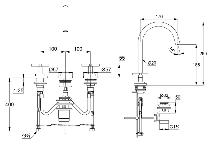 Смеситель для раковины KLUDI Nova Fonte 201430520 с донным клапаном, на 3 отверстия, хром