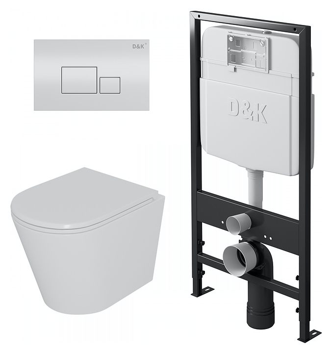 Унитаз подвесной с инсталляцией, сиденьем и клавишей смыва D&K DS1021602 безободковый, белый