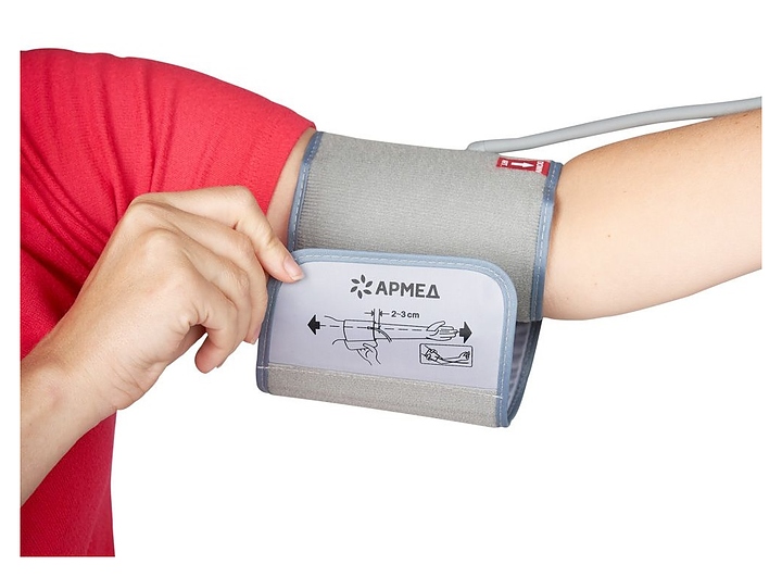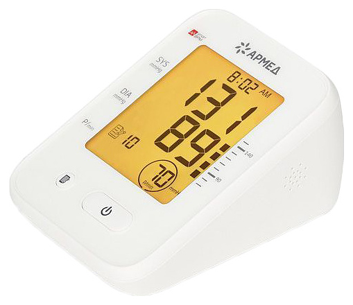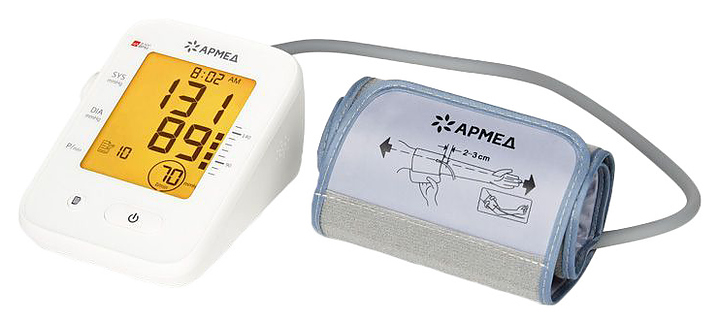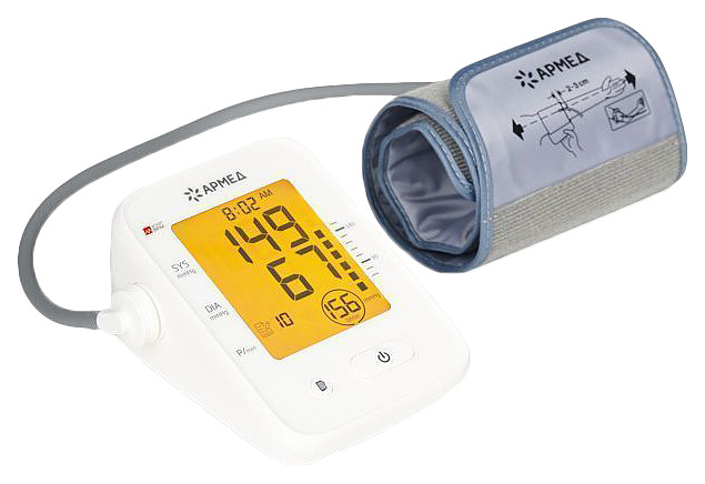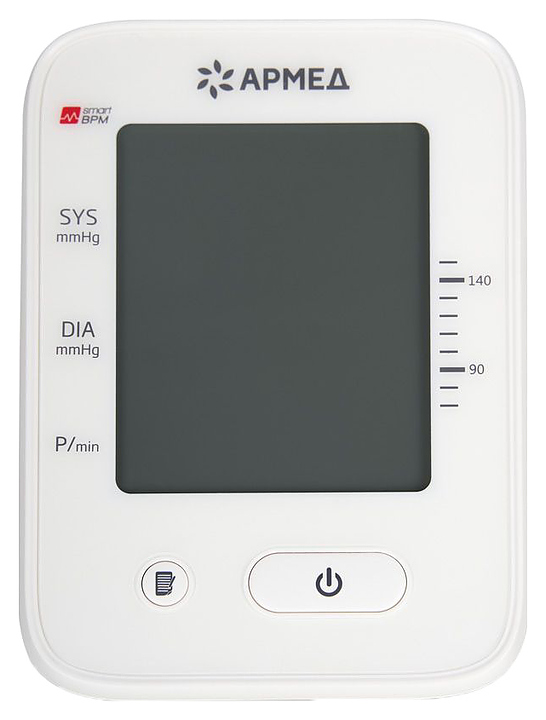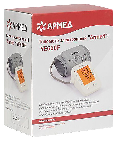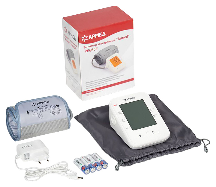 Электронный тонометр Армед YE660F предназначен для измерений максимального (систолического) и минимального (диастолического) артериального давления осциллометрическим методом, а также частоты пульса. Принцип работы основан на анализе параметров сигнала пульсовой волны пациента при снижении давления воздуха в компрессионной манжете. Модель оснащена отсеком для батарей, кнопочной панелью управления и большим информативным жидкокристаллическим дисплеем. Корпус выполнен из ударопрочного пластика белого цвета, манжета – из мягкого гипоаллергенного синтетического материала, упаковка – картонная коробка. В комплект поставки входят наплечная компрессионная манжета, сетевой адаптер постоянного тока, 4 батареи, чехол, заводская упаковка и инструкция по эксплуатации. Особенности: