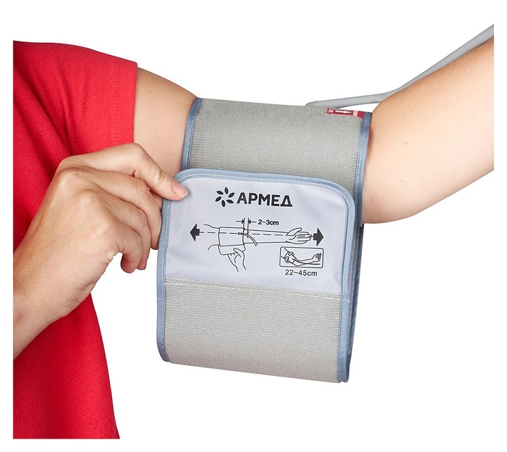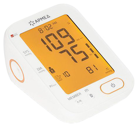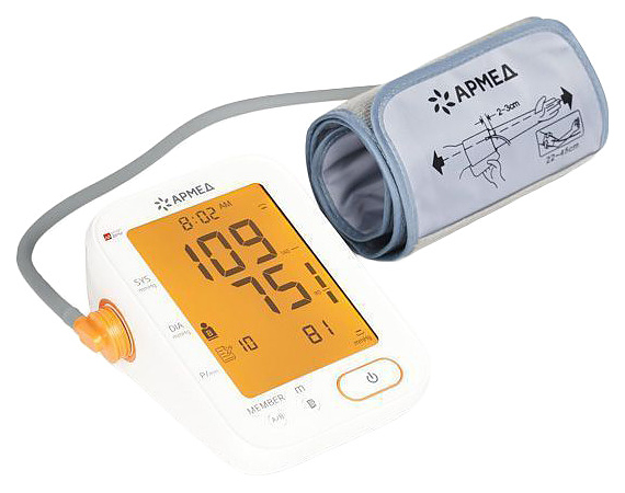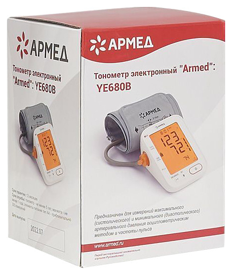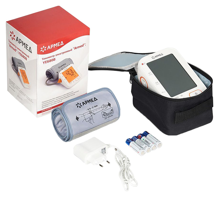 Электронный тонометр Армед YE680B предназначен для измерений максимального (систолического) и минимального (диастолического) артериального давления осциллометрическим методом, а также частоты пульса. Принцип работы основан на анализе параметров сигнала пульсовой волны пациента при снижении давления воздуха в компрессионной манжете. Модель оснащена отсеком для батарей, кнопочной панелью управления и большим информативным жидкокристаллическим дисплеем. Корпус выполнен из ударопрочного пластика белого цвета, манжета – из мягкого гипоаллергенного синтетического материала, упаковка – картонная коробка. В комплект поставки входят наплечная компрессионная манжета, сетевой адаптер постоянного тока, 4 батареи, чехол, заводская упаковка и инструкция по эксплуатации. Особенности: