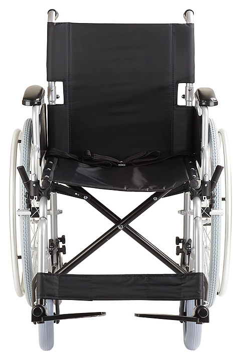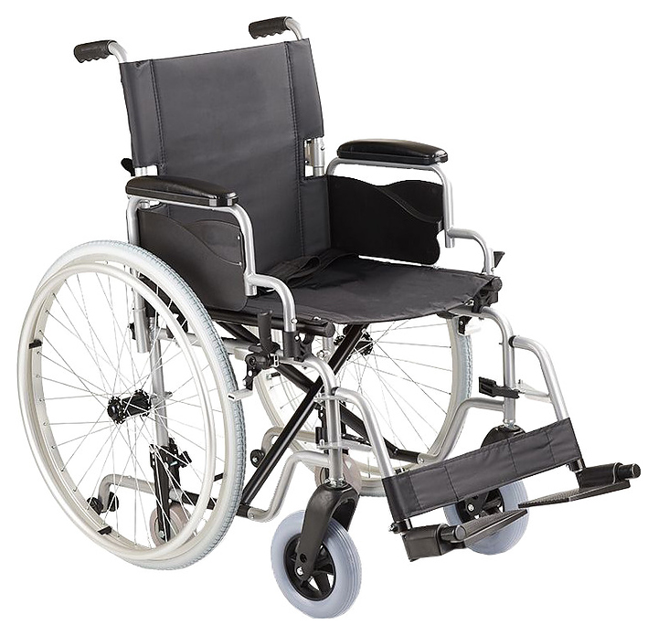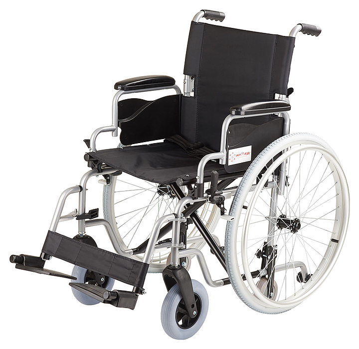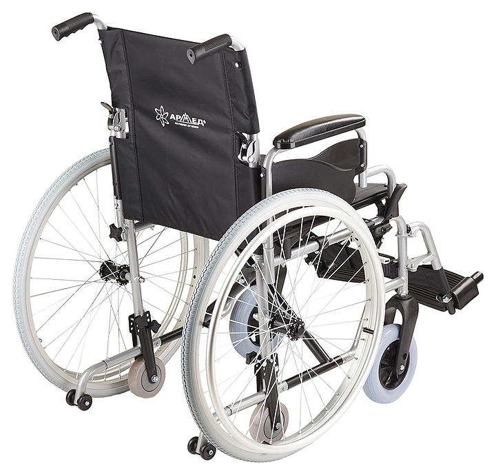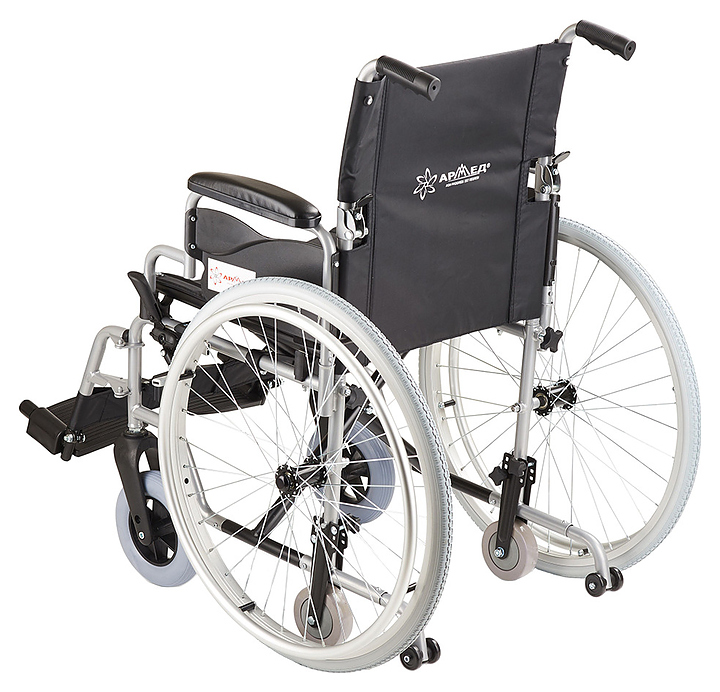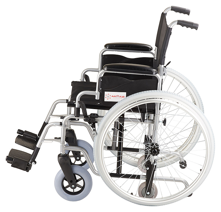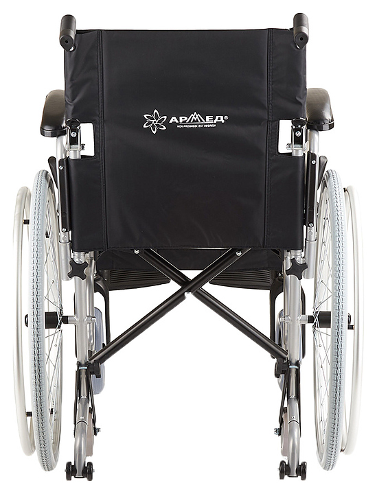 Кресло-коляска Армед H001-1 предназначено для передвижения в сидячем положении людей с повреждениями опорно-двигательной системы и ослабленных из-за болезни пациентов в различных помещениях, а также на улице во время недолгих прогулок по дорожкам с твердым покрытием. Модель оснащена 2 задними колесами с цельнолитыми шинами на металлических ободах со спицами, 2 кольцеобразными рукоятками для самостоятельного перемещения пользователя, 2 цельнолитыми поворотными фронтальными колесами и 2 складными ведущими рукоятками для сопровождающего. Каркас выполнен из алюминия и стали с антикоррозийным покрытием черной порошковой краской, спинка, сиденье и ремни – из устойчивого к растяжению водоотталкивающего прорезиненного полиэстера черного цвета, накладки на подлокотниках – из поролона с обивкой черным кожзаменителем, подножки и рукоятки – из полимеров черного цвета, упаковка – картонная коробка. В комплект поставки входят универсальный ключ, набор крепежа, заводская упаковка и инструкция по эксплуатации. Особенности: