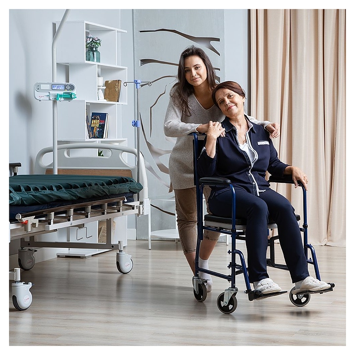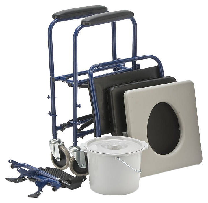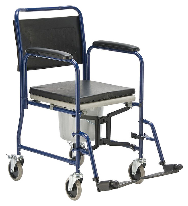 Кресло-каталка Армед H 009B предназначено для облегчения реализации физиологических потребностей пожилых людей, ограниченных в передвижении и ослабленными из-за болезни пациентов в медицинских учреждениях и домашних условиях. Модель оснащена 4 цельнолитыми колесами, съемными сиденьем, стульчаком и круглой санитарной емкостью со складной рукояткой и съемной крышкой. Каркас выполнен из стального трубчатого профиля с антикоррозийным покрытием эмалью синего цвета, сиденье, спинка и накладки на подлокотниках – из искусственной кожи черного цвета, стульчак, емкость и крышка – из полимеров серого и белого цвета, упаковка – картонная коробка. В комплект поставки входят набор крепежа, заводская упаковка и инструкция по эксплуатации. Особенности: