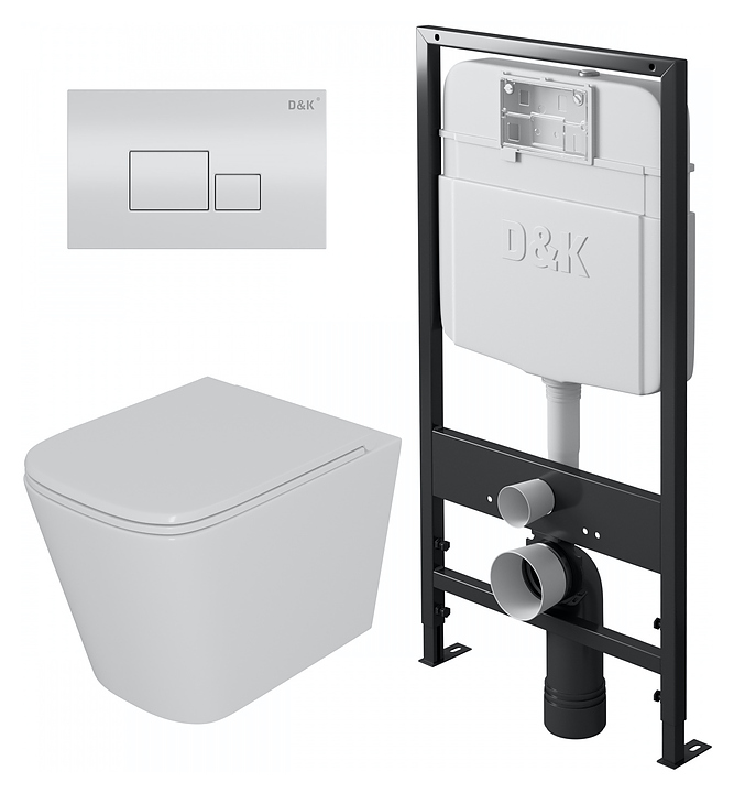 Унитаз подвесной с инсталляцией, сиденьем и клавишей смыва D&K Quadro DS1511602 безободковый, белый