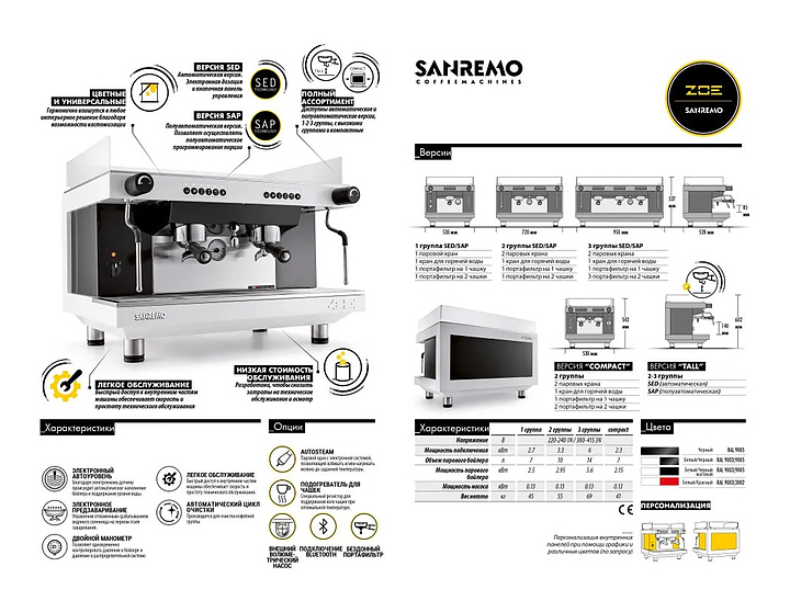 Традиционная рожковая кофемашина Sanremo Zoe Kompact 2 гр. предназначена для приготовления эспрессо и других кофейных напитков в кофейнях, барах и ресторанах. Модель оснащена регулируемыми по высоте ножками. Особенности: