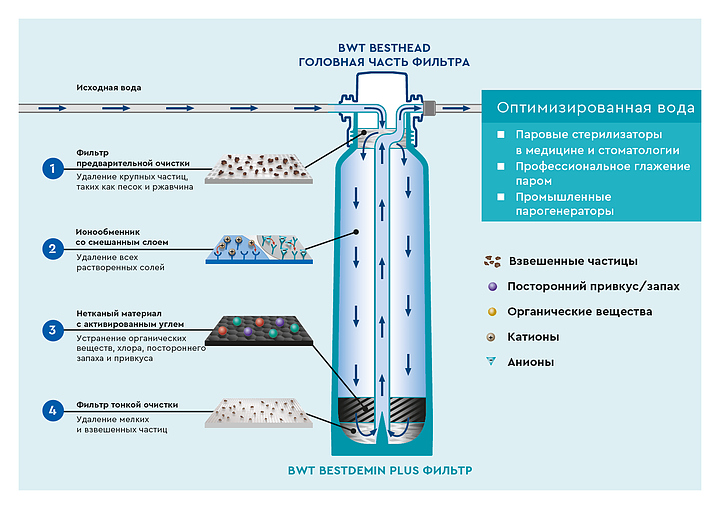 Сменный картридж BWT bestdemin PLUS V используется в составе фильтр-системы bestdemin PLUS в медицинских и стоматологических лабораториях для очистки воды, применяемой в паровых стерилизаторах, промышленных парогенераторах, при профессиональном глажении паром. Многоступенчатая очистка обеспечивает полное опреснение воды. Особенности: