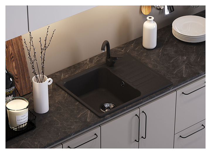 Мойка Polygran QuartzBond Bond-600 предназначена для рационального планирования рабочего места на кухне. Модель оснащена крылом, на котором удобно располагать посуду и другие бытовые принадлежности. Изделие выполнено из кварцевого композита, который отличается внешним видом, напоминающим натуральный камень, способностью поглощать шум воды, стойкостью к действию моющих средств, экологичностью и долговечностью. Сливная арматура в комплект поставки не входит и приобретается отдельно. Особенности: