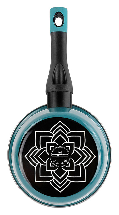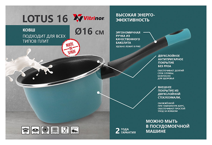 Ковш Vitrinor Lotus 16 используется на предприятиях общественного питания и торговли, а также в домашних условиях для приготовления широкого спектра блюд на любых типах варочных поверхностей, включая индукционные. Модель оснащена эргономичной ручкой с отверстием для подвешивания. Изделие выполнено из стали c ферромагнитными свойствами с двухслойным антипригарным покрытием, не содержащим PFOA, внешнее покрытие - двухслойная стеклоэмаль, обожженная при температуре 820 °С, бирюзового цвета, ручка - из бакелита. Особенности: