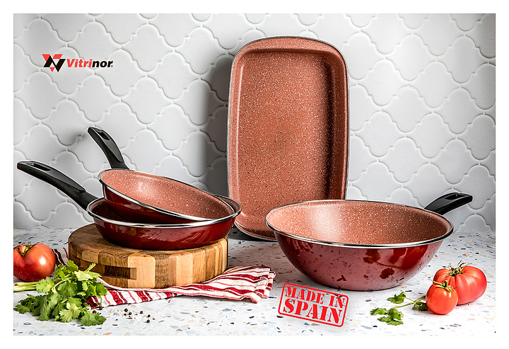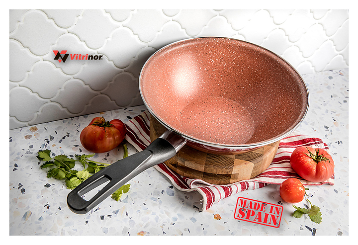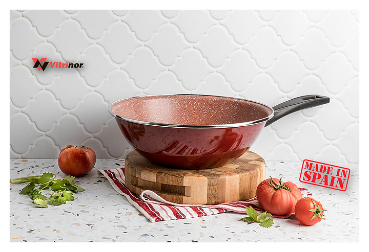 Сковорода-вок Vitrinor Toscana 28 используется на предприятиях общественного питания и торговли, а также в домашних условиях для приготовления широкого спектра блюд на любых типах варочных поверхностей, включая индукционные. Модель оснащена эргономичной ручкой с отверстием для подвешивания. Изделие выполнено из стали c ферромагнитными свойствами с двухслойным антипригарным покрытием, не содержащим PFOA, внешнее покрытие - двухслойная стеклоэмаль, обожженная при температуре 820 °С, терракотового цвета, ручка - из бакелита. Особенности: