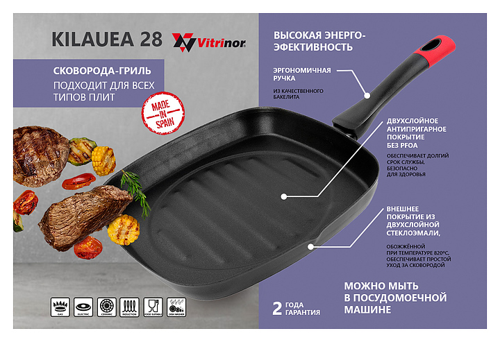 Сковорода-гриль Vitrinor Kilauea 28 используется на предприятиях общественного питания и торговли, а также в домашних условиях для приготовления широкого спектра блюд на любых типах варочных поверхностей, включая индукционные. Модель оснащена эргономичной ручкой с отверстием для подвешивания. Изделие выполнено из стали c ферромагнитными свойствами с двухслойным антипригарным покрытием, не содержащим PFOA, внешнее покрытие - двухслойная стеклоэмаль, обожженная при температуре 820 °С, черного цвета, ручка - из бакелита. Особенности: